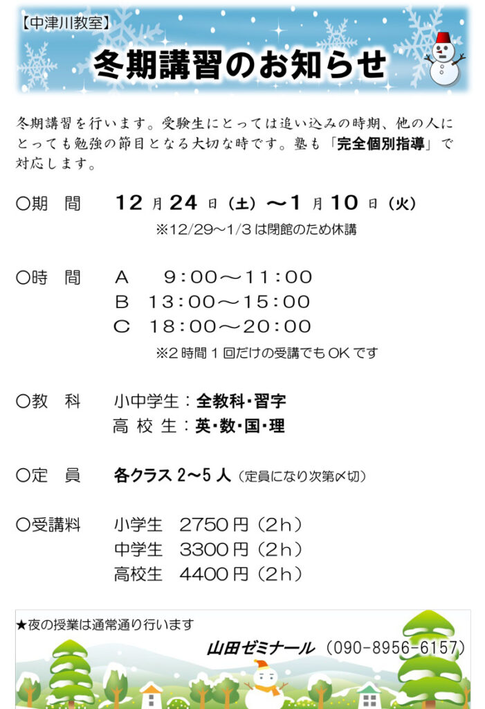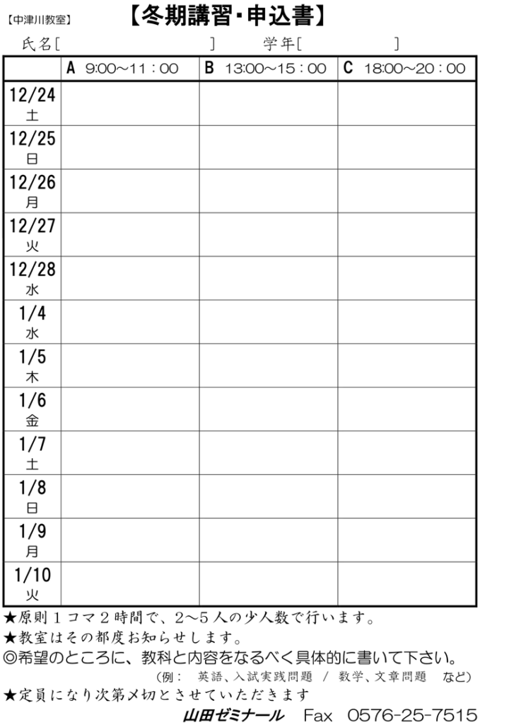冬期講習のお知らせ(中津川教室)