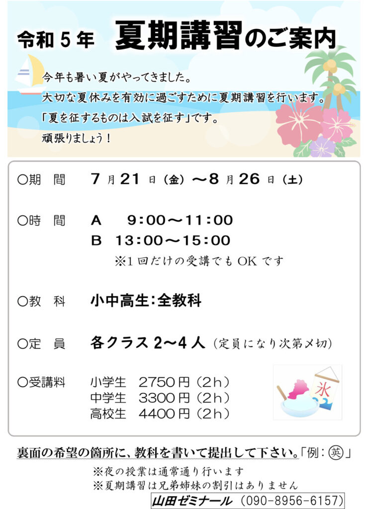 山田ゼミナール下呂教室、令和5年夏季講習のご案内です。
